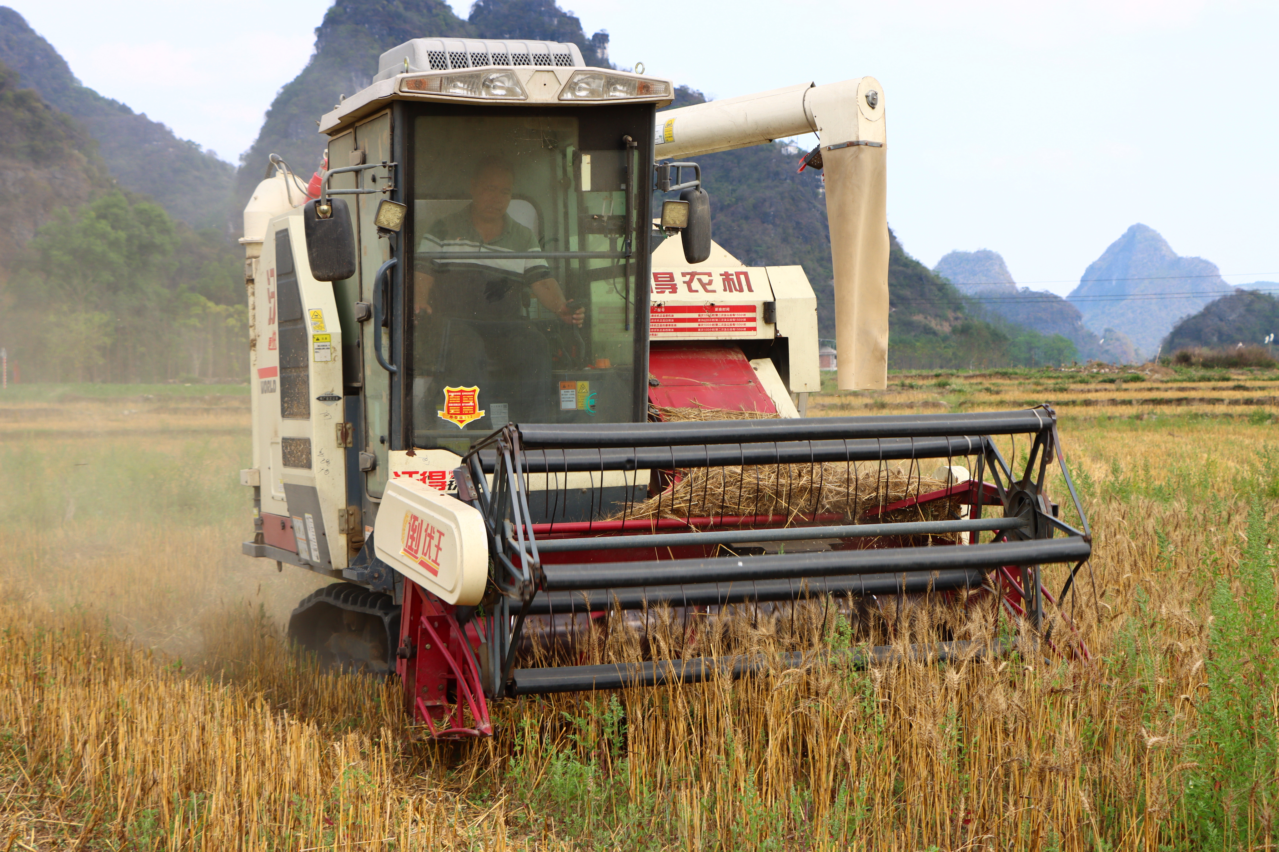春夏之交,在来宾市忻城县思练镇石龙村,1800亩麦田泛起层层金色涟漪。随着大型收割机的轰鸣声响起,金灿灿的麦粒如瀑布般涌入粮仓,在田间绘就“藏粮于地”的美丽图景。这片承载着希望的沃土,半年前还是水稻收割后的“冬闲田”,如今通过耕地保护与综合利用精准施策,实现了向“丰收田”的华丽蜕变。