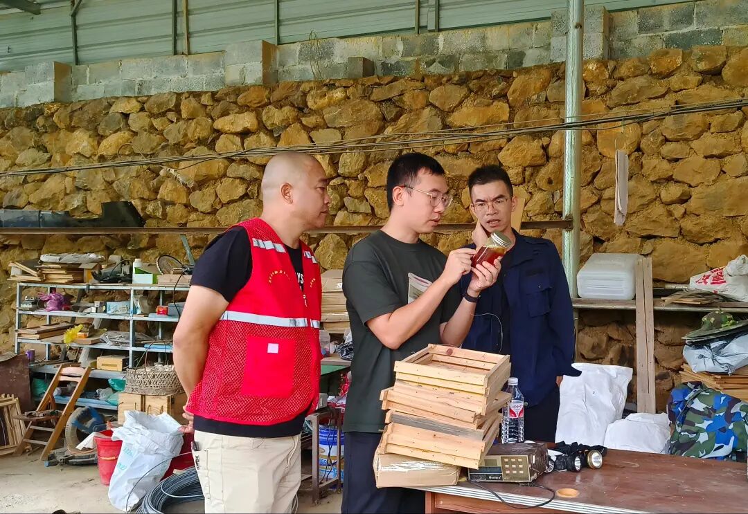吴博(中)向蜜蜂养殖户了解蜂蜜情况