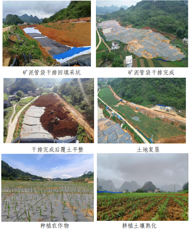 一是坚持分类施策,科学规划土地复垦“路线图”。全面开展基础调查,编制矿区生态修复规划,针对不同矿区的地质地貌特点,推行“一矿一策”的分类修复模式。针对采空区中岩性底板、石芽占比面积较高的特殊地形,开展针对性的设计,通过石芽爆破、土壤回填等措施,平整为规整的耕地或梯田,增加耕地面积,改善农业生产条件。针对高差较大的矿坑,采用土工管袋工艺就地回填矿泥,减少干泥量,缓解排泥库压力。通过因地制宜采取精准的生态修复措施,使采空区土地资源迅速恢复到可利用状态。