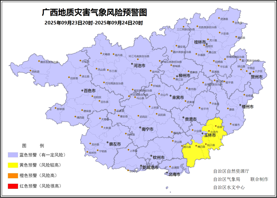 9月23日18时,自治区自然资源厅与自治区气象局、自治区水文中心联合发布地质灾害黄色预警:预报9月23日20时至9月24日20时玉林市容县、陆川县、博白县、北流市发生地质灾害的风险较高(黄色预警)。