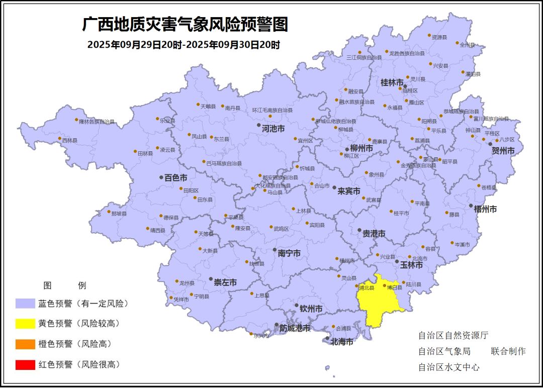 9月29日18时,自治区自然资源厅与自治区气象局、自治区水文中心联合发布地质灾害黄色预警:预报9月29日20时至9月30日20时,玉林市博白县发生地质灾害的风险较高(黄色预警)。